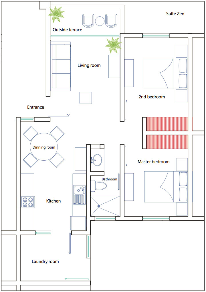 Two bedroom suite on second floor with private terrace (poolside view). Fully furnished, WiFi, cable TV and cookware.